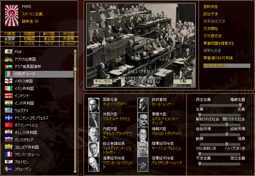 | 右派民主 | プロイセン | 150 | 戦車/潜水/術爆 | 右派独裁 | 連合帝国 | 150 | 騎兵/戦艦/艦爆 | 左派独裁 | イタリア・レーテ | 150 | 山岳/戦艦/艦爆 | |||||